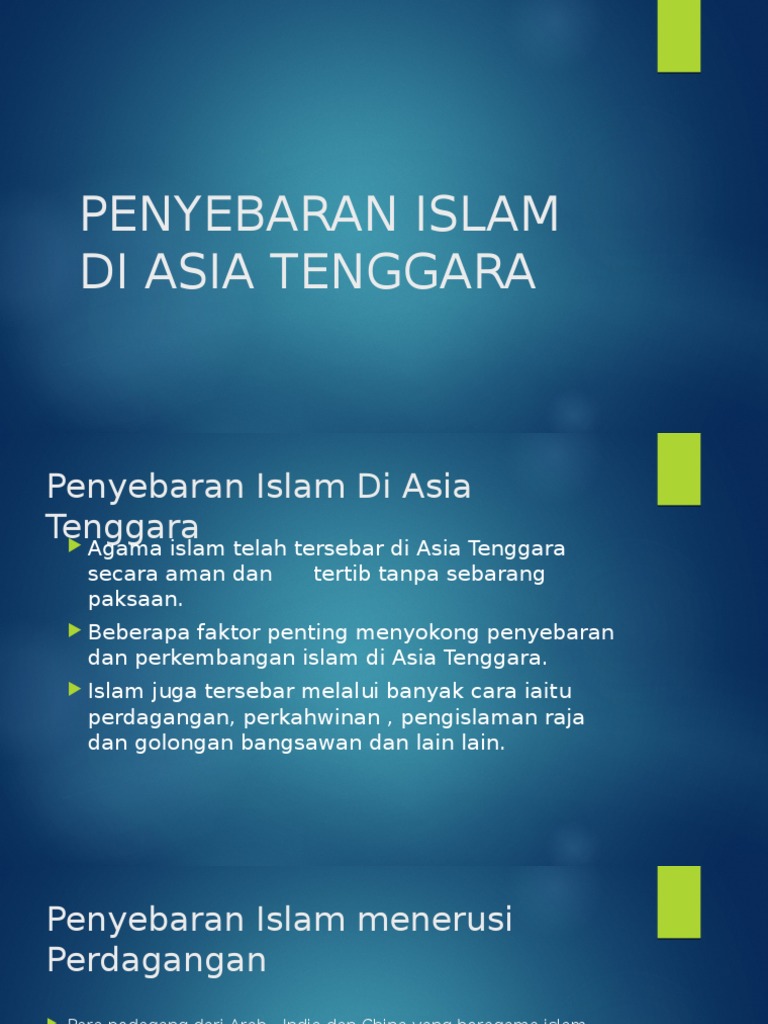 Penyebaran Islam di Asia Tenggara dilakukan dengan penuh August 29 2022 by administrator Asia Tenggara dianggap sebagai wilayah yang paling banyak pemeluk agama. Bagaimana cara penyebaran agama Islam melalui perdagangan. Islamisasi di Asia Tenggara didukung oleh keberadaan para pedagang dan ulama yang berasal dari Jazirah Arab Persia Raya dan Gujarat di wilayah Malaysia pada abad ke-9 Masehi.